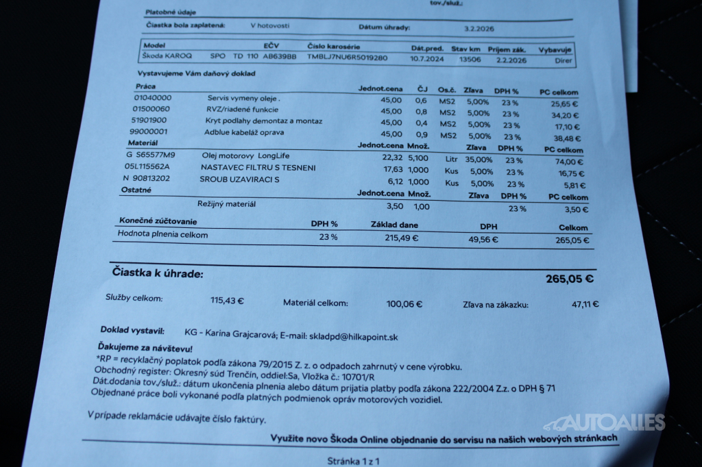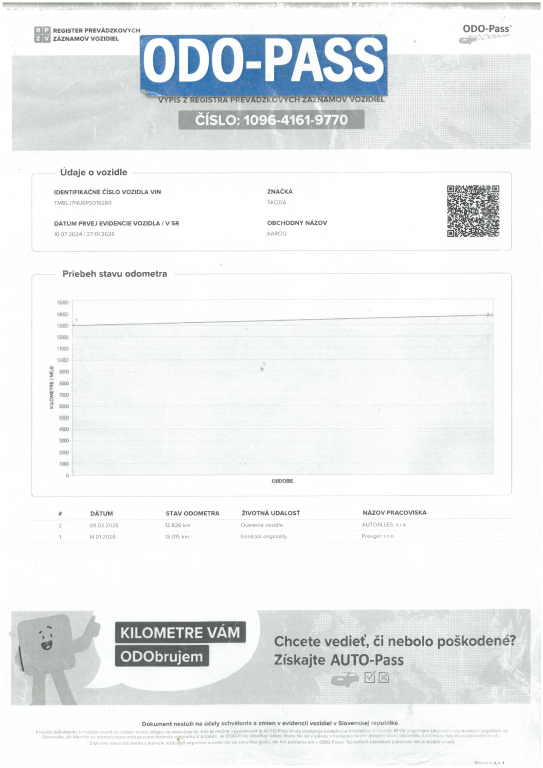 Vozidlo dovezené zo zahraničia / Nemecko. Ku vozidlu je vystavený výpis zo štátneho Registra prevádzkových záznamov vozidiel - ODO-PASS, ktorý zobrazuje históriu najazdených kilometrov vozidla. Maximálne zachovalé - Nájazd iba 13 506!! Vozidlo po servisnej prehliadke v originál servise škoda ( 2. 2026 - 13 506 km - výmena oleja a filtrov ). Karoséria bez škrabancov a preliačenín, bez poškodení. Interiér v stave nového vozidla, po nefajčiarovi. Motor má pravidelný chod, automatická prevodovka radí hladko a bez trhania. Podvozok a nápravy bez problémov. Vozidlo si nevyžaduje absolútne žiadnu investíciu, iba sadnúť a jazdiť. Namontované zimné pneumatiky na hliníkových diskoch 225/50 R18. K dispozícií 2 x kľúč + návod na používanie. AUTOALLES: najväčší slovenský autobazár, už od roku 1990, doživotná záruka na pôvod vozidla s garanciou vrátenia peňazí. Tešíme sa na vašu návštevu.