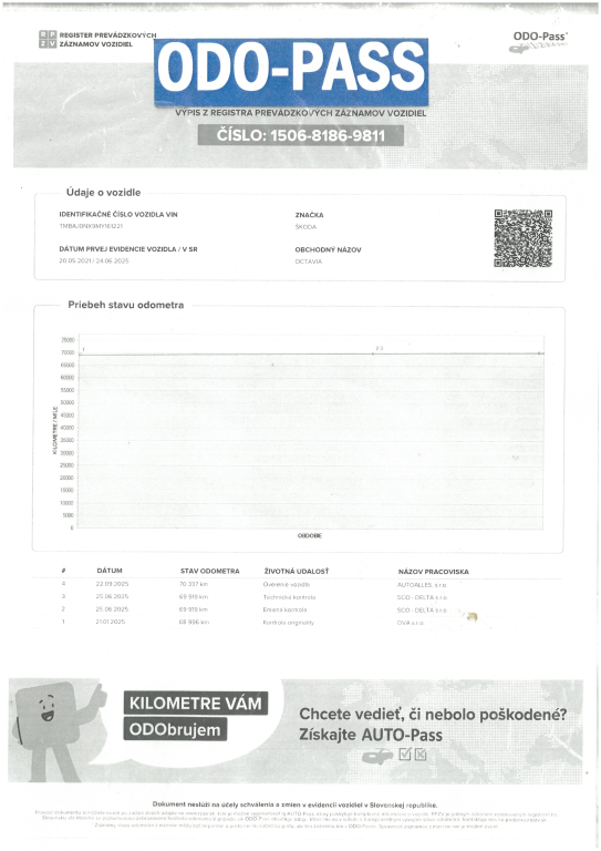 Vozidlo dovezené zo zahraničia / Luxembursko. Ku vozidlu je vystavený výpis zo štátneho Registra prevádzkových záznamov vozidiel - ODO-PASS, ktorý zobrazuje históriu najazdených kilometrov vozidla! Originálne najazdené kilometre si môžete overiť aj u ktoréhokoľvek oficiálneho predajcu Škoda. K dispozícií kompletná elektronická servisná história! Posledná servisná prehliadka 12. 9. 2025 pri 70 337 km - výmena oleja a filtrov. Výmena predných kotúčov a platničiek pri 58 694 km - 19. 3. 2024. Auto maximálne zachovalé v stave nového vozidla, karoséria vozidla bez škrabancov a preliačenín, lak má pekný lesk. Interiér vozidla nepotrhaný a udržiavaný, bez žiadneho poškodenia. Momentálne bez akejkoľvek investície, iba sadnúť a jazdiť. Automatická prevodovka radí hladko, bez zaváhania. Motor a nápravy v perfektnom stave, pri jazde nič nebúcha ani nevibruje, jazda je plynulá. Obuté letné pneumatiky na hliníkových diskoch 225/45 R18. K dispozícií 2 x originál kľúč Škoda. AUTOALLES: najväčší slovenský autobazár, už od roku 1990, doživotná záruka na pôvod vozidla s garanciou vrátenia peňazí. Tešíme sa na vašu návštevu.